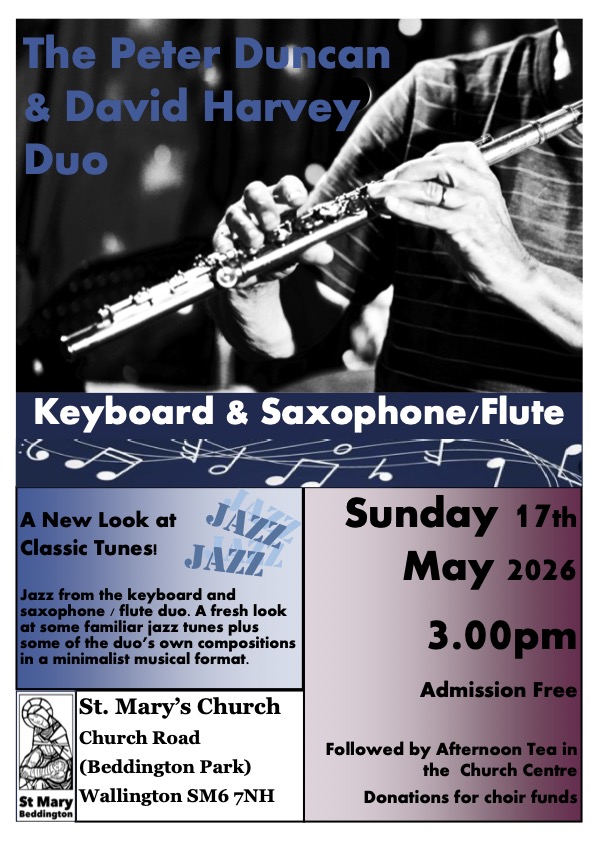 The Peter Duncan and David Harvey Duo play a concert of music for Flute/Sax and Piano on Sunday 17th May at 3 pm. Admission is free. The duo continue their series of jazz concerts with a fresh look at familiar jazz tunes and also perform some of their own compositions in this minimalist musical format